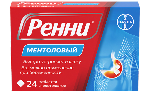 Ренни®️ Ментоловый – антацидный препарат. Кальция карбонат и магния карбонат нейтрализуют избыток кислоты в желудочном соке, помогая защитить слизистую от агрессивного воздействия