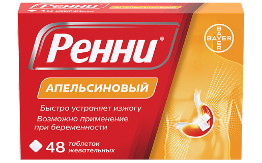 Ренни®️ Апельсиновый – антацидный препарат. Кальция карбонат и магния карбонат нейтрализуют избыток кислоты в желудочном соке, помогая защитить слизистую от агрессивного воздействия