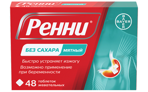 Ренни®️ Мятный без сахара – антацидный препарат. Кальция карбонат и магния карбонат нейтрализуют избыток кислоты в желудочном соке, помогая защитить слизистую от агрессивного воздействия
